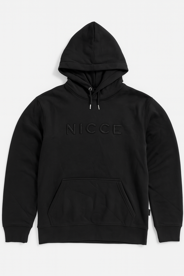Minimalist black pullover hoodie featuring an embossed NICCE logo across the chest. Crafted from a soft cotton blend with drawstring hood and kangaroo pocket for a clean, modern streetwear look.