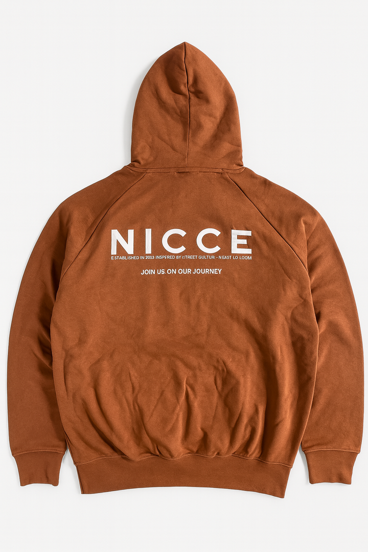 Brown-colored pullover hoodie with NICCE logo print on the front and bold graphic text on the back. Made from a soft cotton blend with drawstring hood and kangaroo pocket for a stylish streetwear edge.
