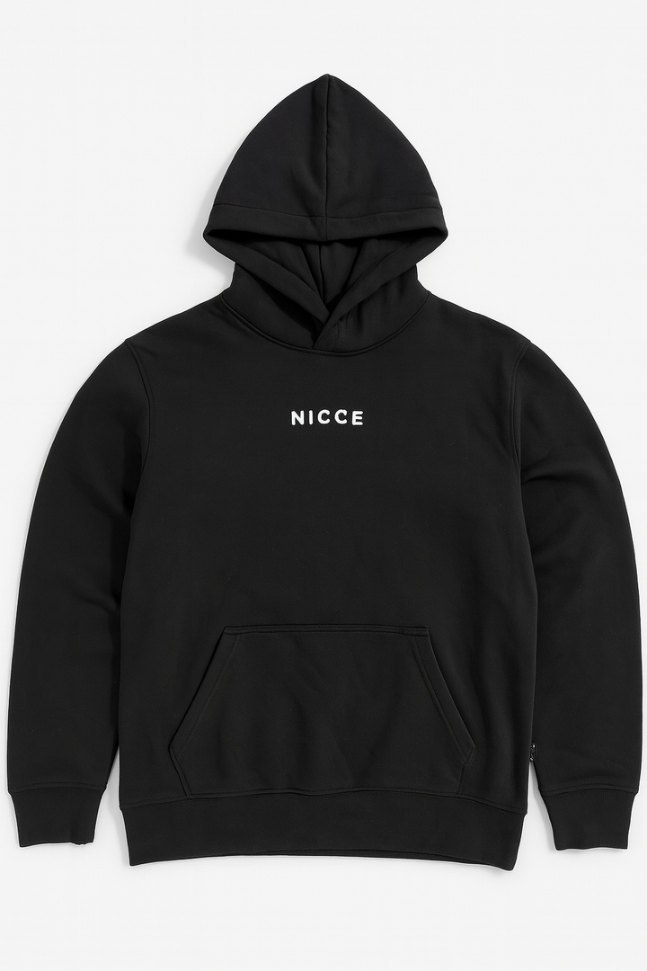 Timeless black pullover hoodie featuring the signature NICCE logo across the chest. Made with a soft cotton blend, drawstring hood, and kangaroo pocket for everyday comfort and clean streetwear style.