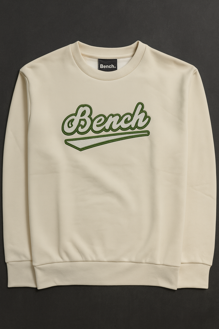 Cream crewneck sweatshirt with embroidered green Bench logo across the chest. Soft cotton blend with ribbed cuffs and hem for a casual and versatile everyday fit.
