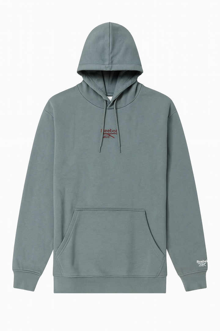 A modern grey pullover hoodie with a subtle embroidered Reebok logo. Made from premium 330 GSM fabric, featuring an adjustable drawstring hood, kangaroo pocket, and ribbed cuffs for a comfortable fit.