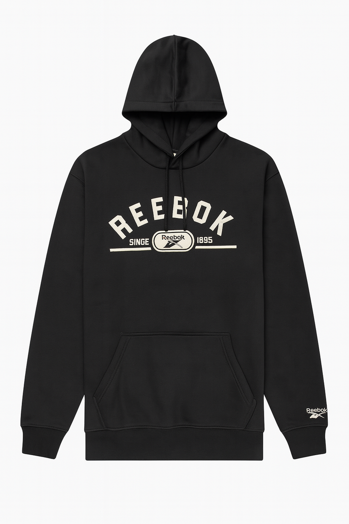 A classic black pullover hoodie with bold Reebok “Since 1895” print. Made from premium 330 GSM fabric, featuring an adjustable drawstring hood, kangaroo pocket, and ribbed cuffs for a comfortable everyday fit.