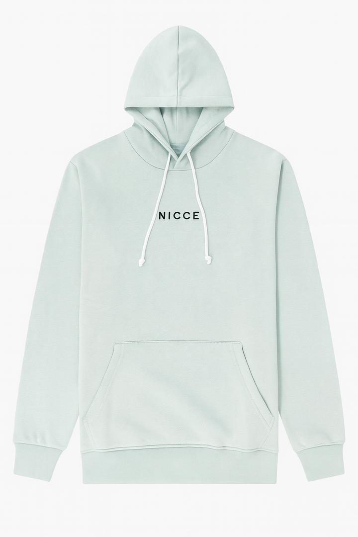 Classic mint green hoodie featuring NICCE logo print, soft cotton blend, 330 GSM weight, and a comfy kangaroo pocket. Perfect for everyday wear.