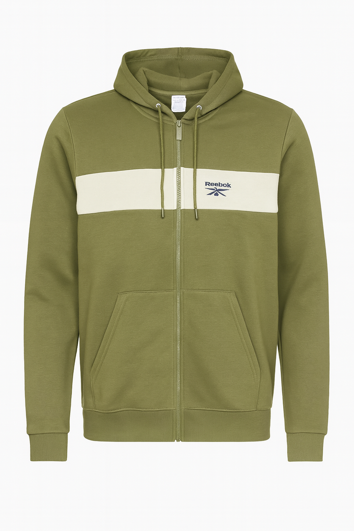 A comfortable full-zip hoodie in olive green with a contrasting white chest stripe. Made from premium 330 GSM fabric, featuring an adjustable drawstring hood, ribbed cuffs, and spacious front pockets.