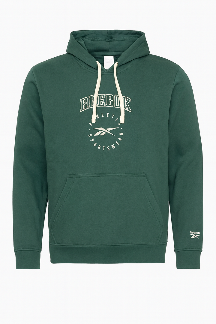 A classic pullover hoodie in deep green with bold Reebok Athletic Sportswear print. Made from premium 330 GSM fabric, featuring an adjustable drawstring hood, kangaroo pocket, and ribbed cuffs for everyday comfort.
